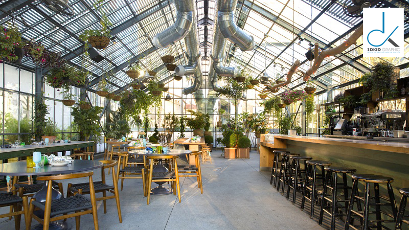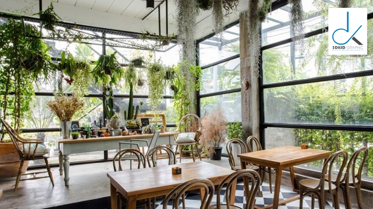 Quán cafe hội thụ cả 2 yếu tố khi giúp cho những vị khác cảm nhận được thiên nhiên gần gũi như đang ở bên ngoài nhưng vẫn đảm bảo sự mát mẻ bên trong ngôi nhà. Trần tường cao cùng những cây xanh, cửa kính giúp ánh sáng thiên nhiên vào trong từ đó con người không cảm thấy bí bách.