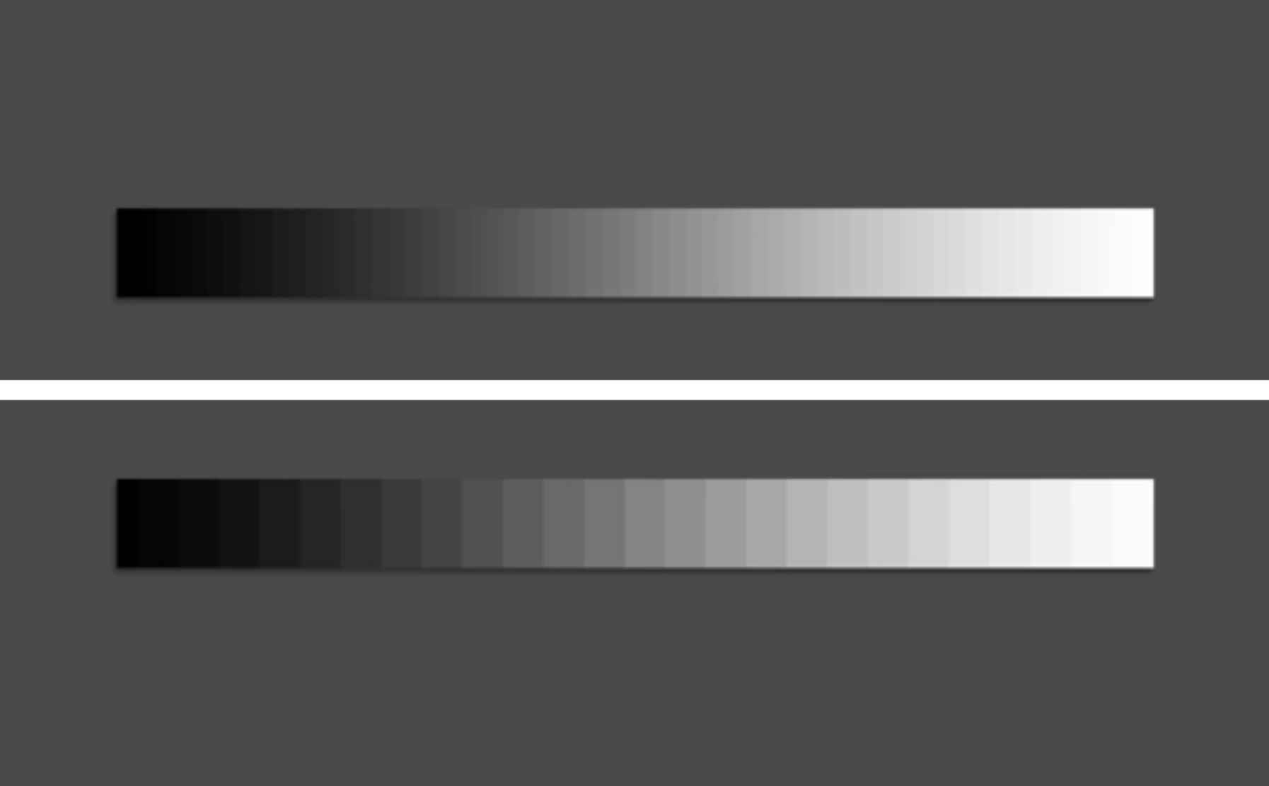 Để dễ hiểu hơn, bạn mường tượng một dải sắc độ màu dịch chuyển từ đen 100% ---> trắng 100%. Bit depth càng lớn thì các bước chuyển sắc độ càng nhiều / dày đặc hơn, quá trình dịch chuyển sắc độ xám mềm mịn hơn. Ngược lại, bit depth thấp (nhỏ) thì sự chuyển dịch sắc độ ít mượt mà mềm mại.