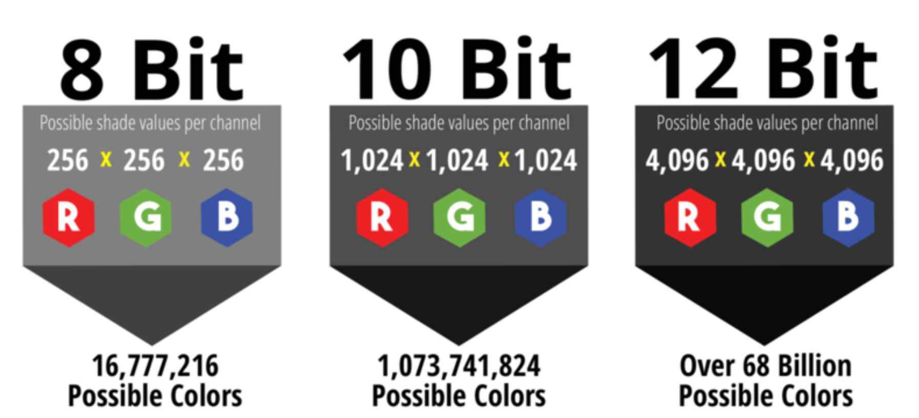 Lưu ý là, khi nói 8-bit, 10-bit hay 14-bit thì nó có giá trị trên từng kênh màu RGB, gọi là BPC (Bits per Channel). Mỗi hình ảnh gồm 3 kênh màu RGB (đỏ, xanh lá, xanh dương) thì hình ảnh 8-bit sẽ là 8-bit màu đỏ, 8-bit màu xanh lá, 8-bit xanh dương.