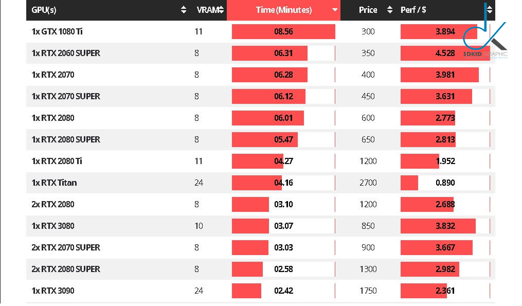 Dưới đây là hiệu suất Render của các GPU qua Redshift: