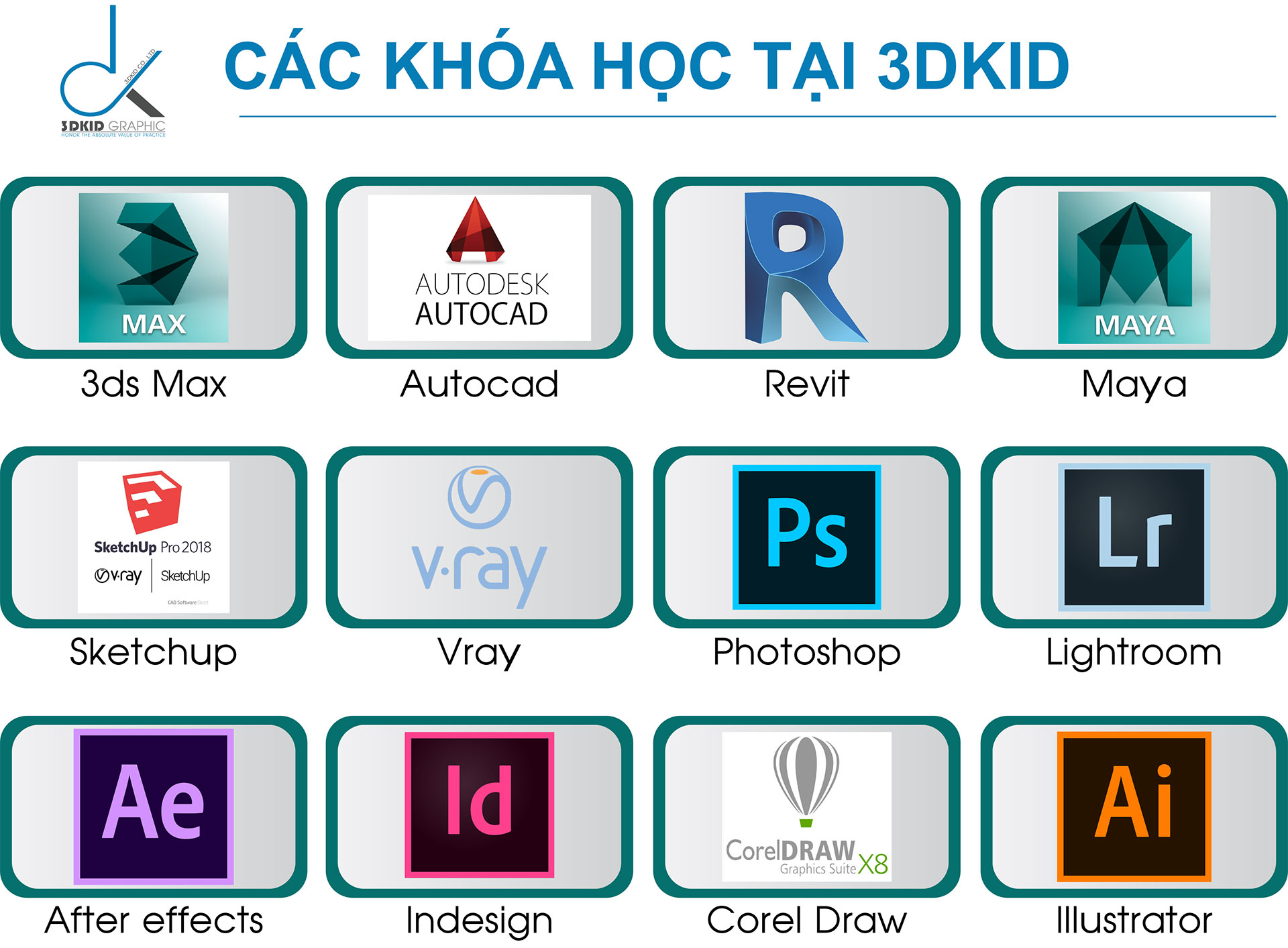 Đồ hoạ 3DKID chuyên cung cấp các khoá đào tạo Đồ Họa Ngắn hạn - Cấp tốc, ứng dụng thực tế trong các bộ môn: Thiết kế Kiến trúc, Thiết kế 3D nội thất, Họa viên kiến trúc, 3Dmax, Vray Render, Autocad, Sketchup, Photoshop, Corel Draw, illustrator (Ai), Revit, Thương mại điện tử (Google Ad, Seo website)...