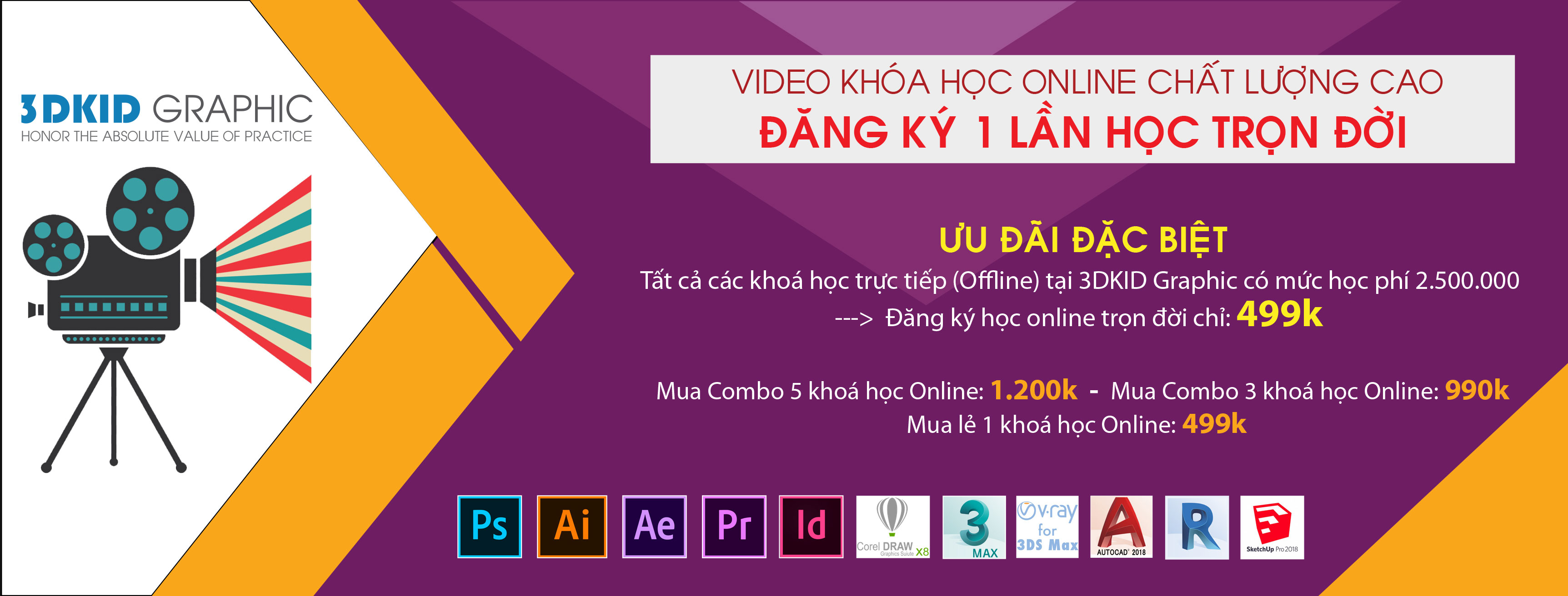 Tất cả các khoá học trực tiếp (Offline) tại 3DKID Graphic có mức học phí 2.500.000 ---> Đăng ký học online trọn đời chỉ: 499k